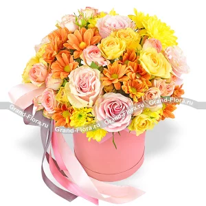 Яркие мотивы – коробка с оранжевыми и желтыми хризантемами