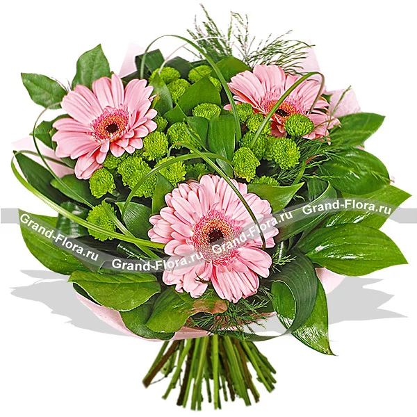 Если ваше сердце околдовано пылкими чувствами, самое время приобрести нежный цветочный букет, чтобы еще раз полюбоваться улыбкой избранницы сердца. Превосходное сочетание нежных герберов, томных зеленых хризантем и зеленого декора делают букет изысканным и романтичным. Такой чудесный презент повернет ваши чувства в новое русло, добавит ярких эмоций и оставит приятный след в мыслях девушки.