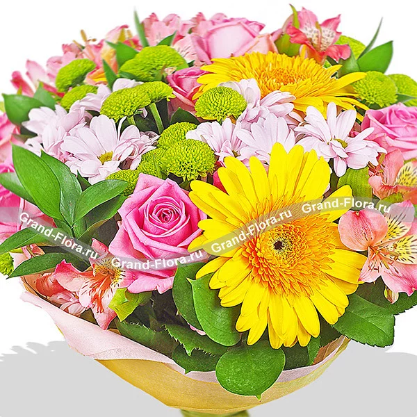 ДЕЛЮКС: роза розовая - 15 шт, гербера желтая - 6 шт, альстромерия розовая - 6 шт, хризантема кустовая зеленая - 5 шт, хризантема кустовая светлая - 4 шт, рускус, фетр желтый. Примерный размер: 45Х45 см.