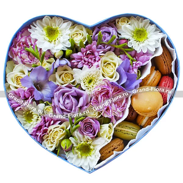 Стандартный (на фото): хризантема белая - 1 шт., хризантема фиолетовая - 1 шт., эустома фиолетовая - 1 шт., роза белая - 5 шт., гвоздика сиреневая - 2 шт., фрезия фиолетовая - 2 шт., оазис, фетр белый, макарунс - 8 шт., коробка в виде сердца (20х20см).