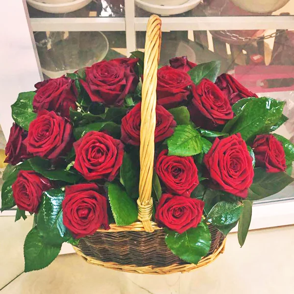 Выбрали 51 розу. Заказали доставку по случаю юбилея нашего руководителя и очень рады что выбрали именно эту компанию! Все соответствует фото на сайте: светлая корзина и отменные, крупные красные розы.